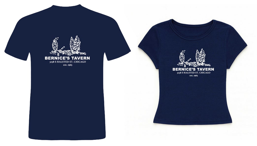 A Bernice's Tavern shirt has finally arrived! Featuring a drawing Bernice had doodled on a bar coaster. Screen printed White ink on Navy blue shirt.